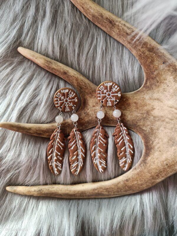 Nämä pienet vegvisir- korvakorut ovat entistä maagisemmat kun niihin on yhdistetty sulat (sulkien pituus 4cm). Sulkien lisäksi koruissa on kivihelmenä kuukivi.  Kuukivi on vahvaa femiinistä energiaa sisältävä kivi. Auttaa kehittämään selvänäköisyyttä ja vahvistaa intuitiota.